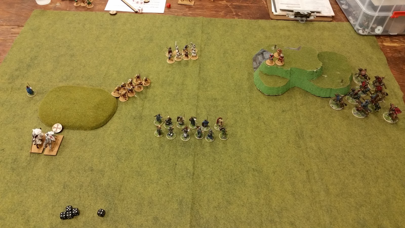 Game 2 was clash of warlords, so kill the enemy leader with no modifications. We even had to use the normal rules for choosing terrain. I was a bit lazy about that so I jsut choose the small hill from last time! The crusaders also had some Flemish along with knights both foot and mounted and some crossbows.